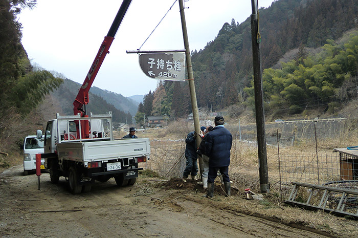 看板上部のパイプが折れています。そして電柱の足場のボルトが残っていたので、このボルトを利用してパイプを固定しようと考えましたが、ボルトと看板のパイプでがあまりにも太さが違って不安定なため、看板のパイプの中に水道パイプなどを押し込んで太さを合せようと考え、看板のパイプの中に水道パイプを打ち込んでいます。