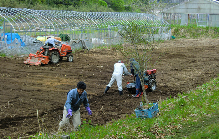 まずトラクターで起こします、その後に化成肥料を入れます。