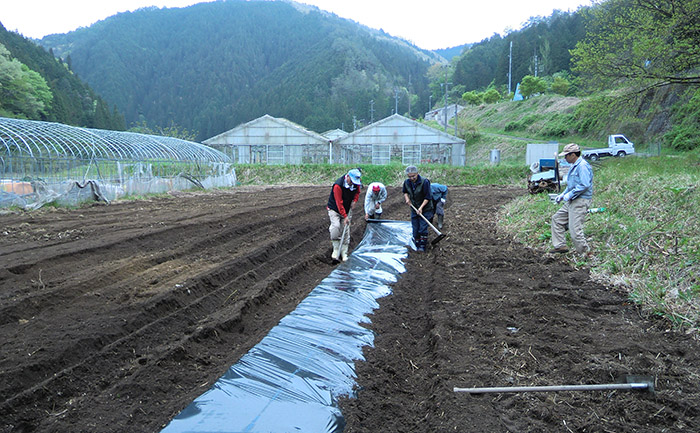 やや雨も降り出してきたため、本日の作業は終了!マルチを2面貼り終えました。