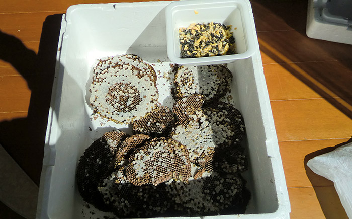 4個ほどの巣をゲット、これから幼虫を抜きます。