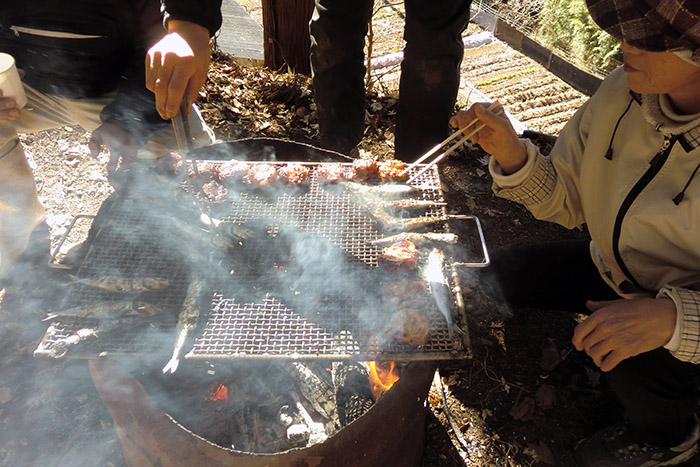 お祀りが終わって直会、それぞれが持ち寄った漬物などとお供えのお下がりを頂きます。
