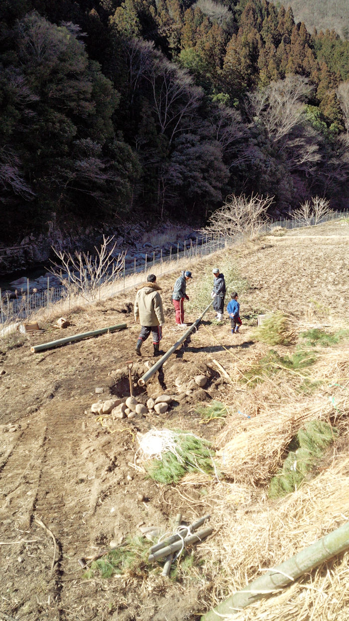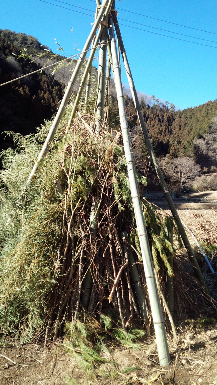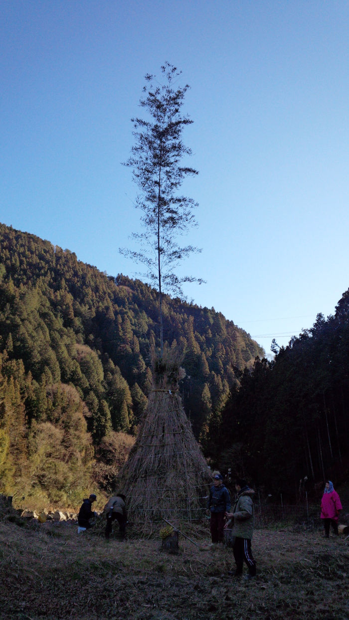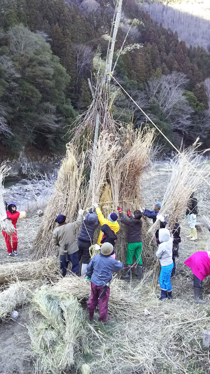 旧正月の大晦日、河上瀬でどんど焼きの準備が行われました。 金城大学の学生が応援隊として駆けつけてくれました。