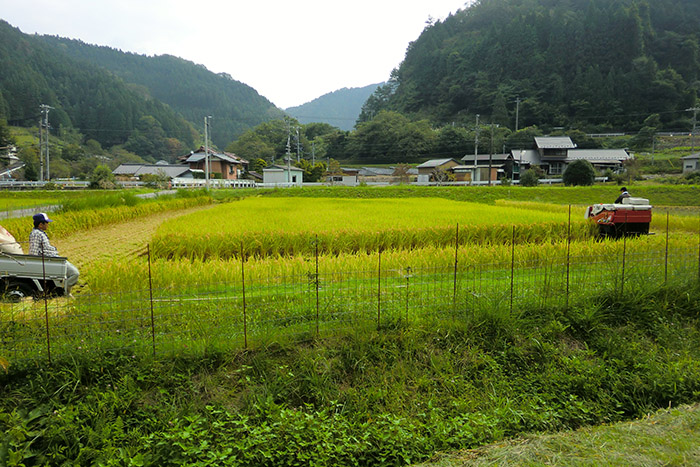 大野瀬でもポツポツと稲刈りが始まりました。 おじいさんは指導役で、コンバインはお孫さんにお任せ? (優しいお孫さんですね)